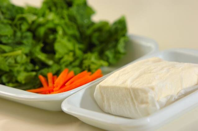 菜の花は根元を切り落とし長ければ2~4等分に切る。根元部分は縦2~4等分に切る。ニンジンは皮をむいて細切りにする。
