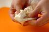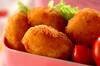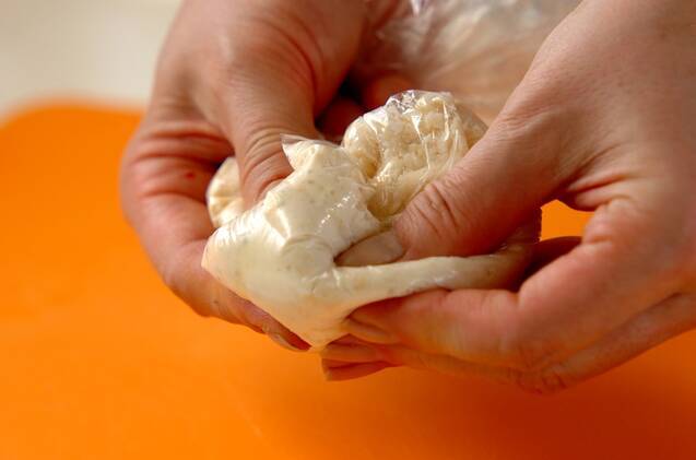 抗菌の袋に揚げ油以外の材料を入れてもむようにして混ぜる。小判型に形を整え、180℃の揚げ油でキツネ色になるまで揚げる。
