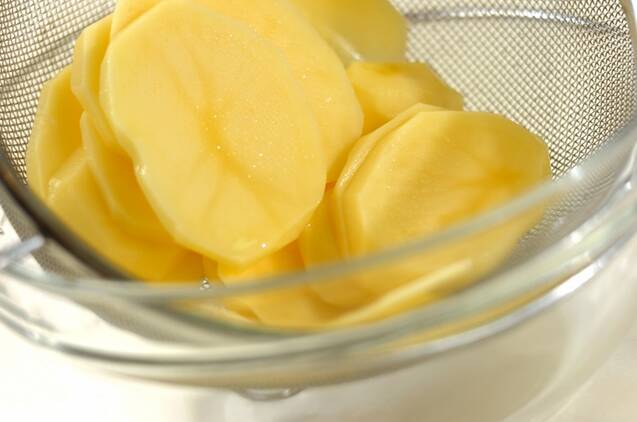 ジャガイモは皮をむいて薄切りにし、水に放ち、白濁したらザルに上げる。オーブンを230℃に予熱し始める。サバ缶はザルに上げて水気を切る。