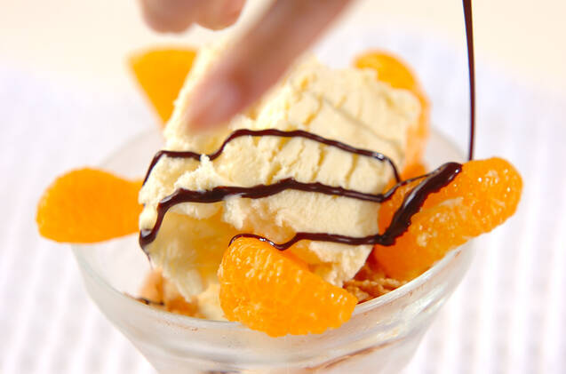 よく冷やした器にバニラアイス、コーンフレーク、バニラアイス、みかんの順に盛り合わせ、お好みでチョコシロップを掛けて、ミントの葉を飾る。