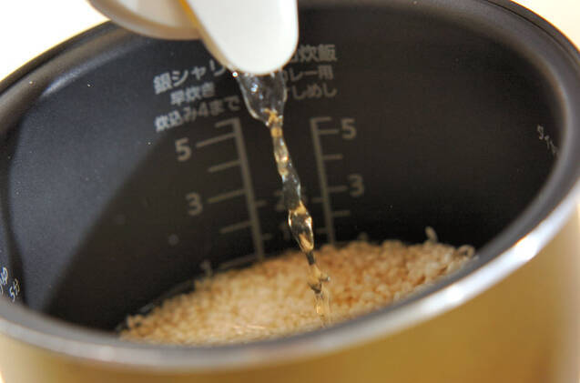 炊飯器に洗ったお米、<調味料>の材料を入れ、通常に炊く時の水量線までのだし汁を注ぎ、ニンジン、油揚げを入れて普通に炊く。
