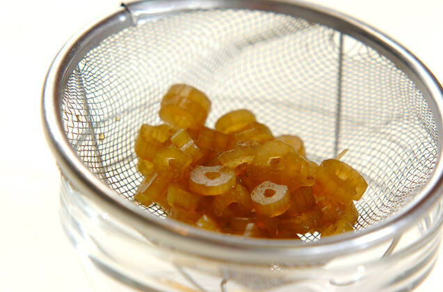 小鍋に<下味>の材料を煮たててフキを入れ、3~4分煮てザルに上げ、煮汁をきっておく。