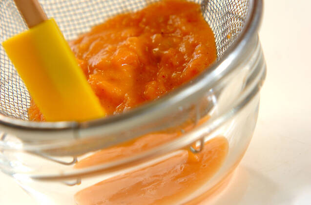 ミキサーにかけ、目の粗いザルでこし、大きな繊維を取り除く。味見して、再度塩、コショウで味を調えます。