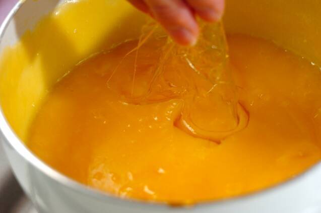 (9)を中火にかけ、ヘラでよくかき混ぜ、沸騰してトロミがついたら火を止め、水気をきったゼラチンを入れる。氷水に当て、レモン皮を入れ混ぜながら冷ましてしっかり熱を取る。