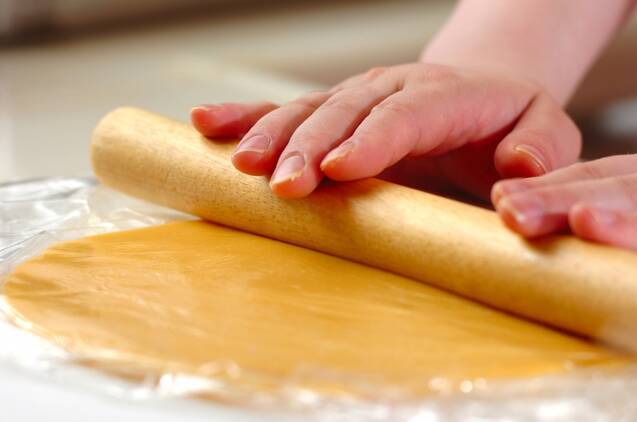 休ませたら手で軽くもみほぐしてラップに挟み、麺棒で厚さ約3mm、型より一回り大きくなるように伸ばす。