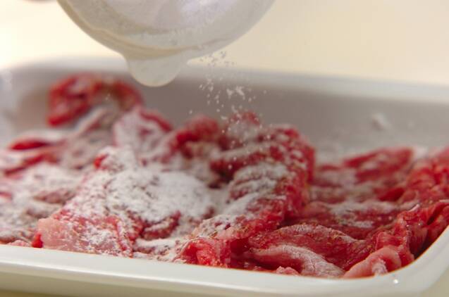 牛肉は食べやすい大きさに切って塩コショウし、両面に片栗粉をまんべんなく振る。