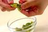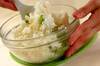 ボウルに、(1)、オリーブ油、塩、チリメンジャコを加え、混ぜ合わせ、ご飯を加え、さらに混ぜ合わせる。