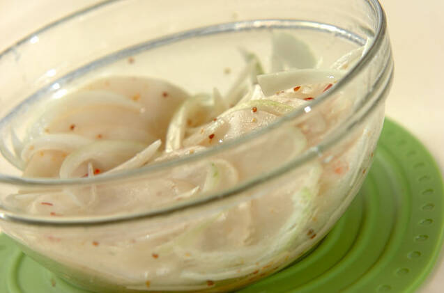 <ドレッシング>のボウルにカブ、玉ネギを加え、5分浸けておく。