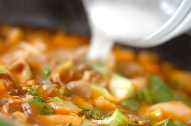 2に<合わせ調味料>を加えて強火にし、2~3分煮て<水溶き片栗>を回し入れてトロミをつける。