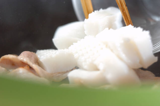フライパンにサラダ油大さじ1を強火で熱し、豚肉の表面が白っぽくなるまで炒め、イカも加えて炒め合わせ、いったん取り出す。