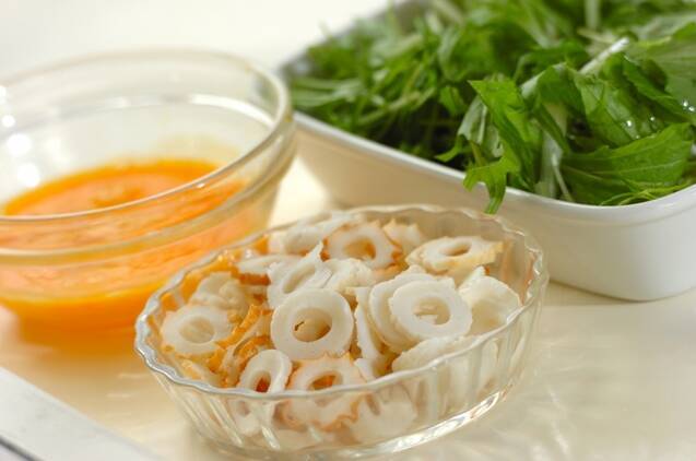 ちくわは薄い輪切りにする。卵は割りほぐす。水菜は根元を切り落とし、長さ3cmに切る。