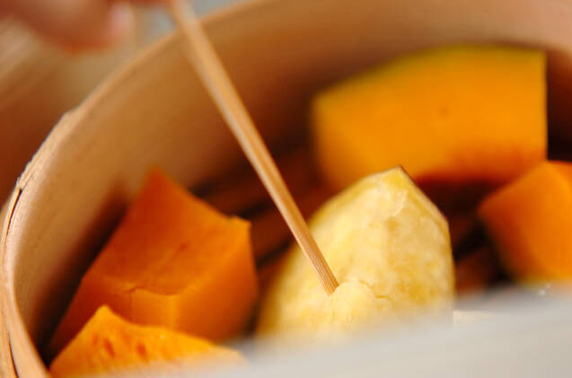 せいろにカボチャ、サツマイモを入れて、しっかり湯気が上がった蒸し器に入れて、柔らかくなるまで蒸す。竹串がスッと刺さったらOKです。器に盛ってミルびき岩塩をかけ、バターを添える。