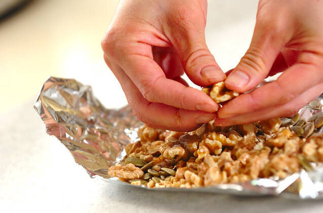水を人肌程度に温める。ナッツはローストし、粗く砕いておく。型に分量外のバターをぬっておく。オーブンを190℃に予熱する。