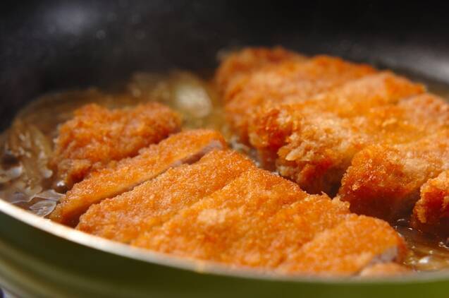 (2)の真ん中にトンカツを入れて、蓋をして中火で2分煮込む。卵の半分量をまわしかけて、蓋をして30秒煮込む。