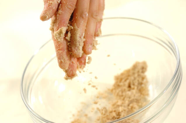 全体に混ざったら手をこすり合わせ、ポロポロ状になれば冷蔵庫に入れておく。(ヒント)作りにくい場合は2~3倍量で作り残りは冷凍できます。
