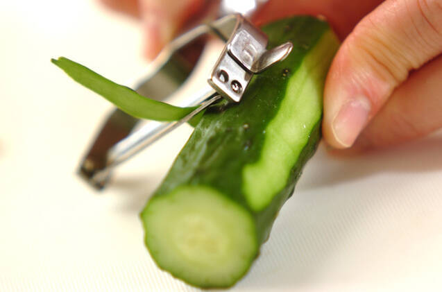 キュウリは端を切り落として縦じまに皮をむき、縦半分に切る。さらに斜め薄切りにして冷水に放ち、シャキッとしたらザルに上げる。