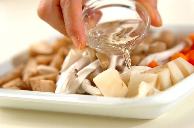耐熱容器にゴボウ、レンコン、ニンジン、シメジを入れて白ワインをかける。ラップをかけて電子レンジで2~3分加熱し、そのまま粗熱が取れるまでおき、余熱で中までしっかり熱を入れる。竹串を刺して中まで柔らかくなっているか確認して下さい。電子レンジは600Wを使用しています。