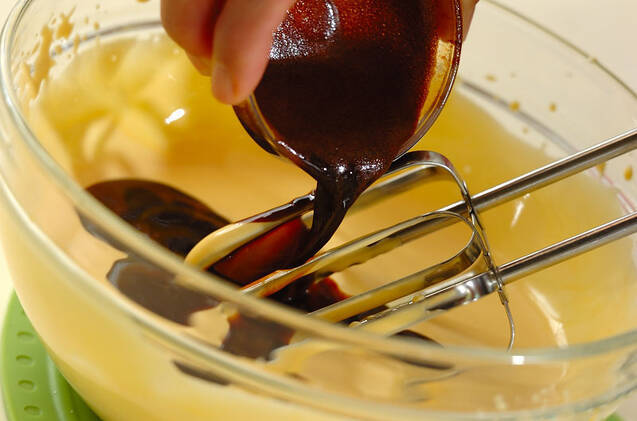(1)にサラダ油を加えてしっかりと混ぜる。混ぜ合わせておいた<コーヒー液>を加えて、均一に混ぜる。