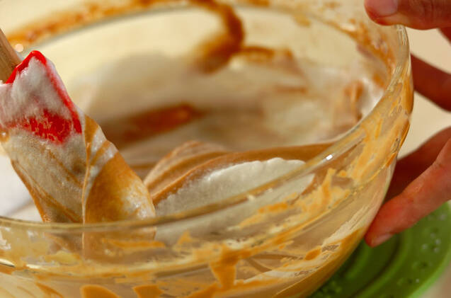 (3)に3分の1量の<メレンゲ>を加える。ゴムベラで均一に切り混ぜる。さらに3分の1量の<メレンゲ>を加えて、8割程度混ざるまで切り混ぜる。