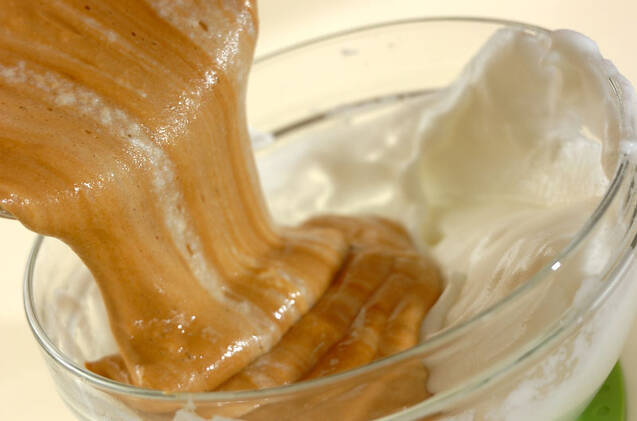 残りのメレンゲを片方に寄せて(5)を流し入れる。均一になるまで、ゴムベラで切り混ぜる。少し高い位置からシフォン型に流し入れる。