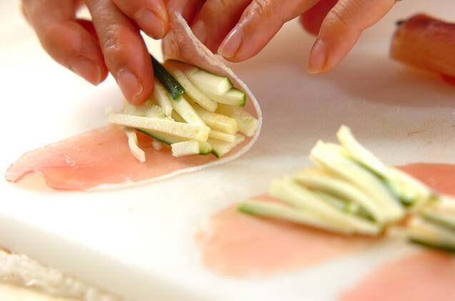 ズッキーニを生ハムで巻くように包み、器に盛る。塩コショウ、EVオリーブ油をかける。