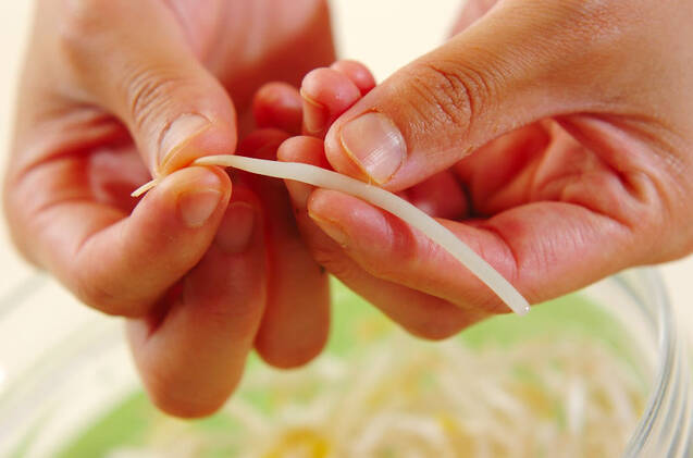 モヤシは根を取ってたっぷりの水につけ、パリッとしたらザルに上げる。