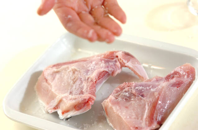 ブリカマはサッと水洗いして並べ、酒をかける。手に塩を持ち、ブリの20~30cm位上から指の隙間を通して塩を落としながら、全体にまんべんなく振りかける。15分置いておく。
