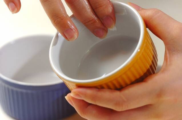ココットの内側に分量外のショートニングをたっぷりぬっておく。