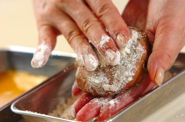 (3)のタネに<衣>の小麦粉をまぶし、余分な粉をはたく。溶き卵、パン粉を順につける。