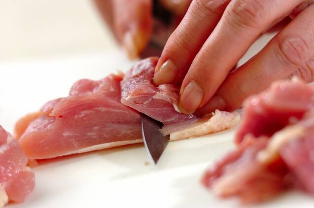 鶏もも肉は大きめのひとくち大の削ぎ切りにし、塩コショウで下味をつけ、小麦粉をまぶす。