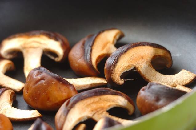 フライパンを熱してシイタケの断面を下にして入れ、強火でから焼きする。焼き色がついたら裏返して焼く。器に盛り、(2)を添える。