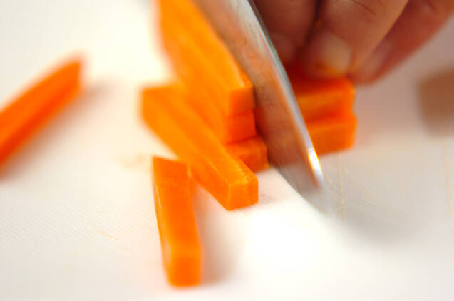 大根、ニンジンは皮をむき、5mm角の棒状に切る。