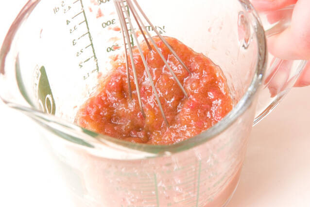 <ドレッシング>の梅干しは種を取り、細かく包丁でたたきペースト状にし、他の材料と混ぜ合わせる。