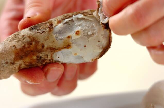 里芋は皮付きのまま水洗いし、ぬれたままラップで包み、電子レンジで3分加熱する。上下を返してさらに1~2分加熱する。粗熱が取れたら手で皮をむき、ひとくち大に切る。