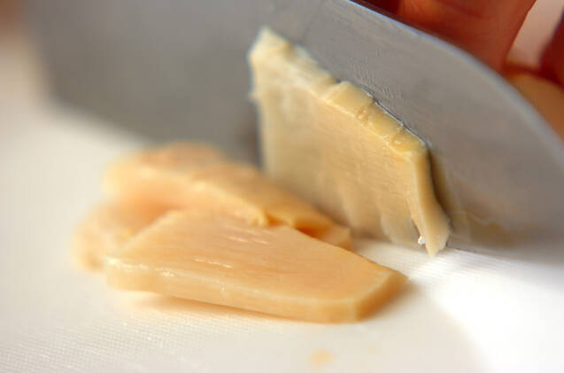 水煮タケノコは薄切りにする。鶏ひき肉に酒を振る。ニラは長さ4cmに切る。