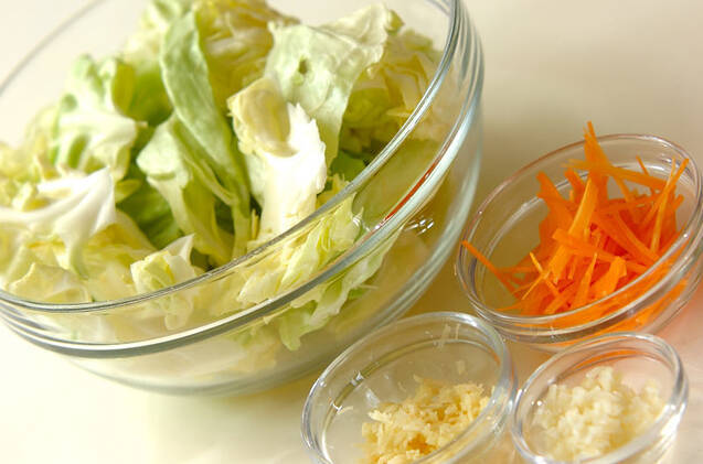 キャベツはひとくち大にちぎり、ニンジンは斜め薄切りにし、さらにせん切りにする。ニンニク、ショウガはみじん切りにする。