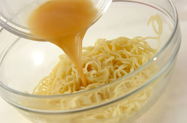 (2)の中華麺に(3)のスープをかけ、ゴマ油を加えて麺をほぐす。器に盛り、残りの具をのせる。