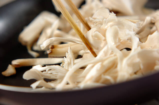 フライパンにゴマ油を熱し、白マイタケ、エリンギを炒め、全体にしんなりしたら<調味料>の材料を加える。