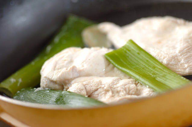 フライパンに鶏むね肉を入れ、塩、酒、ショウガ、白ネギの青い部分を加え、肉の厚みの半分まで分量外の水を注ぎ入れる。火にかけて煮たったら弱火にし、蓋をして6~7分蒸し焼きにし、そのまま粗熱を取る。