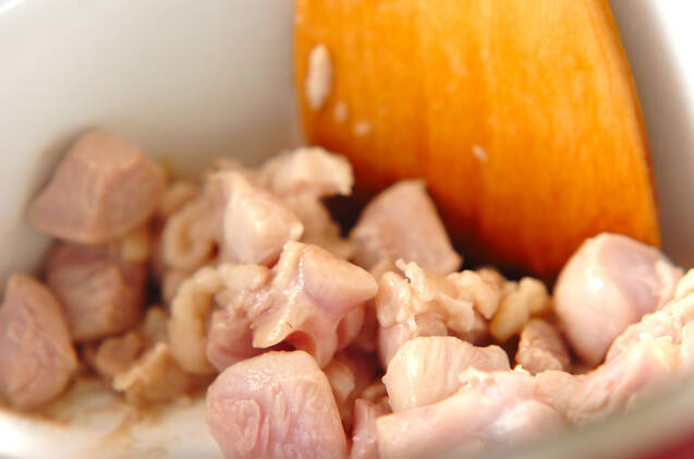 鍋にサラダ油を熱し、鶏もも肉を炒める。