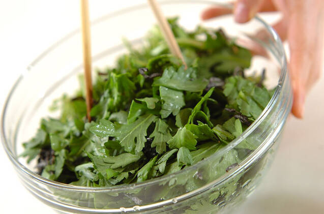 ボウルに菊菜と塩昆布を合わせ、菊菜が少ししんなりするまでおいておく。器に盛り、ゴマ油、白ゴマをかける。