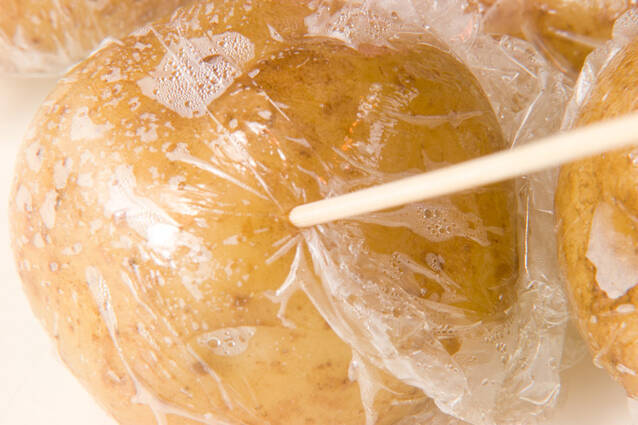 ジャガイモは皮ごときれいに水洗いし、ぬれたままラップで包み、途中向きを変えながら、電子レンジに7~8分かけ、竹串がスッと刺さるくらいまで柔らかく加熱する。