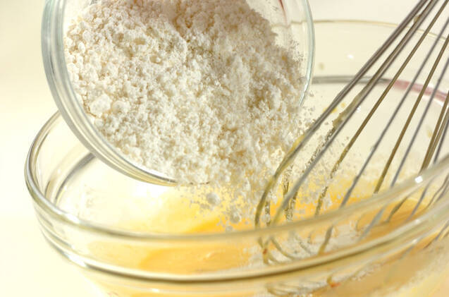 (2)に桜の花の塩漬けを加えて混ぜ、さらにホットケーキミックスを加えて粉っぽさがなくなるまで混ぜる。