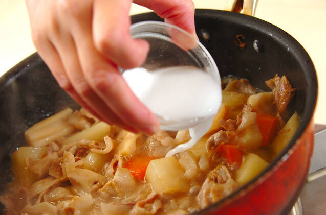 最後にしょうゆを加え、<水溶き片栗>をまわし入れる。全体にトロミがついたら、大根葉を加えてザックリ合わせ、火を止めて器に盛る。