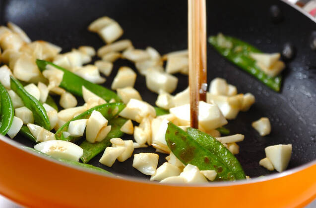 フライパンにサラダ油を強火で熱し、キヌサヤを炒める。薄く色がついたら白身を加え、サッと炒め合わせる。