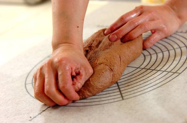 ボウルに振るっておいた粉類を入れ、インスタントドライイーストを混ぜ溶かした牛乳を入れて混ぜ、ひとまとまりになったら無塩バターを加えて8割ほどこねる。