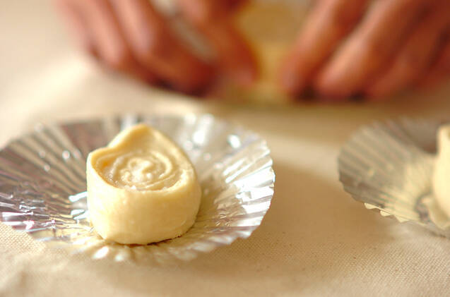ナイフで8等分に切り、断面を上にしてアルミカップの上にのせる。