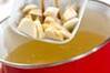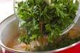 玉ネギが透き通ってきたら、みそを溶き入れ、最後に菊菜を加えてひと混ぜして、器に注ぎ分ける。
