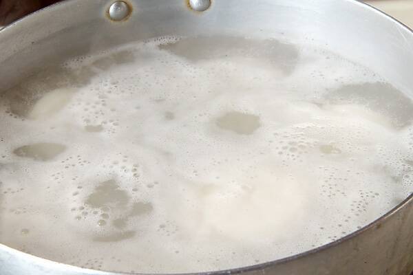 大根は皮を厚めにむき、4~6つの輪切りにし、煮くずれない様に面取りする。片面に十字に切り込みを入れる。鍋に、あれば米のとぎ汁、なければ水に大1の米を加え、大根と共に入れて火にかける。煮立てば火を弱め、15分下ゆでする。