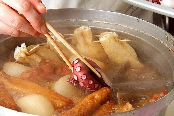 タコ、もち入油揚げ加え、10~15分煮る。煮汁が少なくなってくればだし汁を加えて下さい。取り皿に取り、刻みネギを振りかけてだし汁を少しかけ、好みで練りからしやユズコショウをつけていただく。